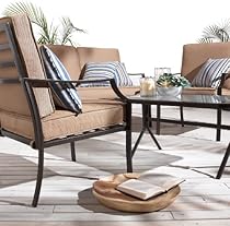 This all weather resin wicker patio set is perfect for the summer days and nights. The steel frame provides maximum strength while the weatherproof resin wicker makes cleaning easy as cake.